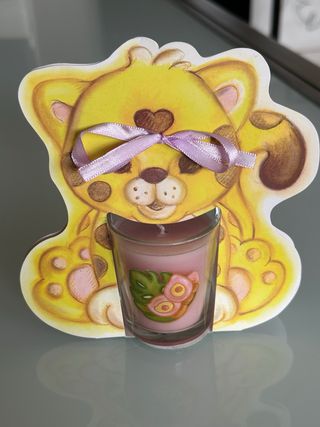 Portacandele della collezione We Are Jungle di Thun. Un simpatico personaggio con un fiocco in nastro. - Decorazione floreale sul bicchiere. - Design colorato e giocoso. Portacandele Thun della collezione "We Are Jungle" con un motivo a leopardo e una candela profumata all'ananas. • Design: Presenta un simpatico pack sagomato a forma di leopardo con un fiocco lilla. • Candela: La candela è contenuta in un bicchiere di vetro decorato con un motivo floreale tropicale. • Fragranza: La candela ha una fragranza all'essenza di ananas. • Edizione: È un articolo in edizione limitata.