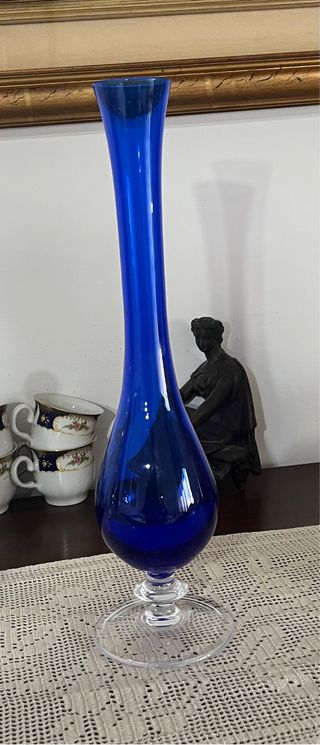Vaso vintage in cristallo blu cobalto con base a piedistallo in vetro trasparente. Questo oggetto è identificato come un vaso in cristallo al piombo (24% PbO) di produzione italiana. Presenta una forma slanciata a "solifleur" con un corpo a goccia che si restringe in un collo lungo e sottile. Materiale: Vetro artistico, spesso attribuito alla manifattura di Murano o a designer come Flavio Poli per Seguso, specialmente per i modelli in vetro sommerso degli anni '60 e '70. Caratteristiche: Il colore blu cobalto intenso contrasta con la base circolare in cristallo trasparente. Questi vasi sono ricercati nel mercato del modernariato e