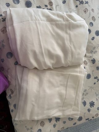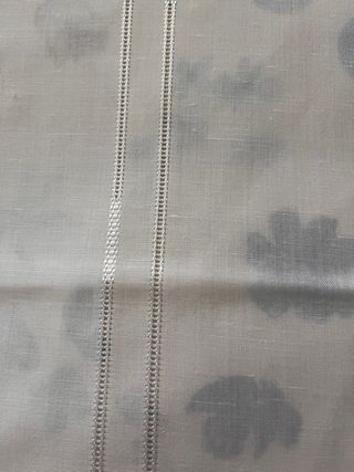 Coppia di tende in tessuto bianco. Altezza cm. 292 (parte alta, dove arricciata) Larghezza cm. 300 Lunghezza cm. 267 Balza cm. 28 circa Ricamo in fondo come da foto