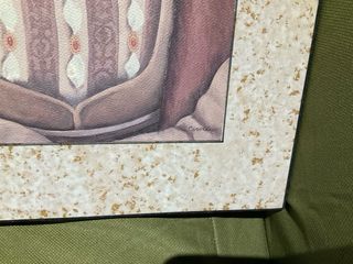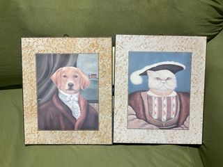 Coppia di quadri con raffigurazioni di un cane e un gatto vestiti in abiti d'epoca. - Stile pittorico classico. - Cornice decorata con texture marmorizzata.