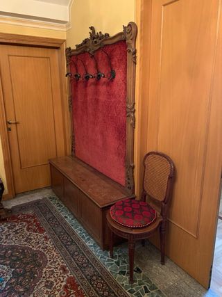 Delizioso set da entrata d’epoca. Composto da cassapanca con appendiabiti in legno intagliato, schienale in tessuto velluto damascato con finiture in borchie bronzate ed appendiabiti in ferro battuto nero( misura totale 200x153x38cm.) e sedia in stile Luigi Filippo in legno e con sedile e schienale in paglia di vienna( cuscino omaggio). Usato e con minimi segni di vissuto come da foto ma in più che buone condizioni e dalla patina meravigliosa. Articolo d’arredo funzionale e molto decorativo per amanti degli arredi d’antiquariato. Solo ritiro a mano a carico dell’acquirente in zona Seveso( MB). NON CONSEGNO E NON SPEDISCO!!!