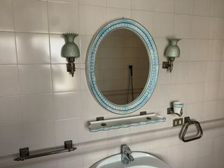 Meraviglioso e raro set da bagno in porcellana di Capodimonte d’epoca. Vintage anni’50/60. Composto da n.1 specchio+ n.2 applique+ n.1 mensola+n.2 porta asciugamani +n.1 porta spazzolini + n.1 lampadario plafoniera. Materiale porcellana e metallo. Usato e con segni di vissuto come da foto ma in condizioni accettabili. Straordinario e vivace set da bagno di rara reperibilità per seri amanti dell’arredoamento d’epoca. Preferenza al ritiro a mano in zona Seveso(MB). Possibilità di consegna in province limitrofe a carico dell’acquirente da concordare. NON SPEDISCO!!!