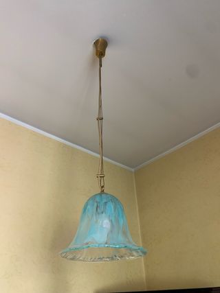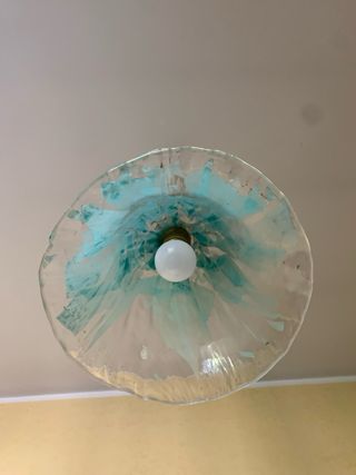 Splendido lampadario a sospensione design La Murrina. Vintage anni’70. Materiale vetro di Murano azzurro/trasparente a fazzoletto. Originale marchiato e firmato. Misura 25x15cm. Misura altezza totale 105cm. Usato e vissuto ma in ottime condizioni estetiche. Articolo favoloso per amanti di illuminazione di modernariato design.