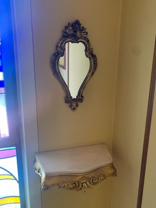 Elegante set da ingresso con specchio e consolle. - Cornice dello specchio finemente lavorata. - Piano della consolle in marmo. - Dettagli decorativi in metallo dorato.