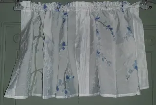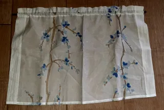 Deliziosa coppia di mantovane con un elegante motivo floreale. - Motivo floreale blu su sfondo bianco. - Realizzate in tessuto leggero e semitrasparente. Le mantovane sono state cucite a mano e dispongono di doppio passante. Le misure sono L60xH40 In ottimo stato