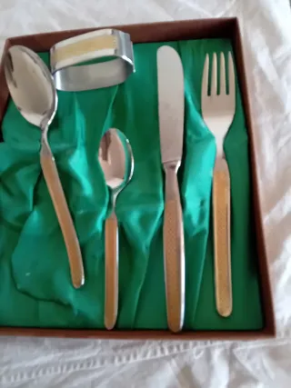 Elegante set di posate vintage con manici in bambù e dettagli in metallo. - Manici in bambù naturale. - Dettagli in metallo lucido. - Custodia inclusa per una conservazione ordinata.13 pezzi con scatola timbrati effepi inox 18/81