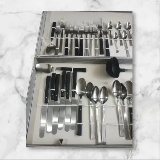 Elegante set di posate completo, ideale per ogni occasione. Questo set unisce la resistenza del metallo alla praticità della plastica. - Include forchette, coltelli e cucchiai. - Manici neri per un tocco di stile. - Finitura in acciaio inossidabile. Il pacco comprende: 📌6 coltelli 📌12 cucchiai 📌17 cucchiaini 📌Un mestolo con raccoglitore in plastica 📌11 forchette ✴️ Il tutto consegnato in scatola come da foto. È un offerta, le posate sono sfuse e non più utilizzate dal proprietario. Le posate prima di essere inviate sono igienizzate.