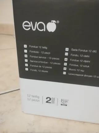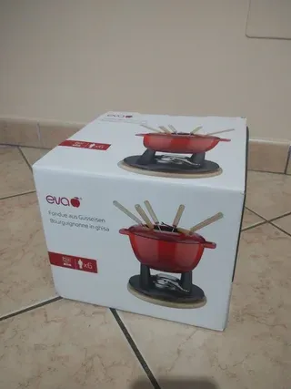 Set per fonduta bourguignonne di marca Eva. - Pentola in ghisa rossa. - Base in metallo e legno. - Include 6 forchette.