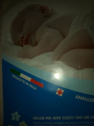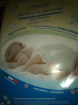 Completo neonato antisoffoco carrozzina,cuscino 31x21 cm.,materassino 70x35 cm., tessuto cotone interno in resina espansa,marca Nancy, antiacaro,anallergico, prodotto in Italia