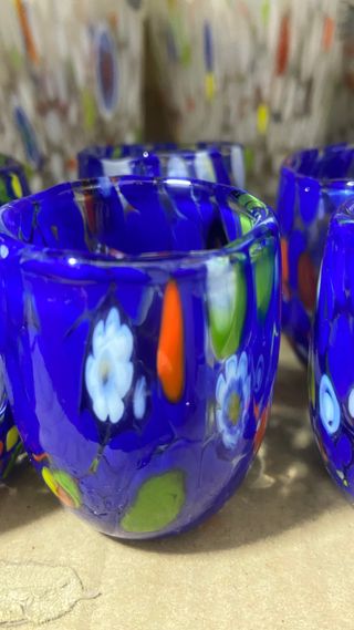 Set da 6 bicchieri in vetro di Murano con un design vibrante e colorato. - Decorazione a macchie multicolori su fondo blu. - Realizzati in vetro di Murano autentico. - Ogni bicchiere presenta un motivo unico. con murrina