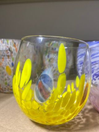 Eleganti bicchieri realizzati a mano di Murano. Il design vivace e colorato li rende unici. - Decorazione a gocce gialle. - Inserzioni decorative colorate. - Fatti a mano in Italia.