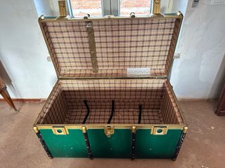 Grande baule da viaggio vintage stile industriale in metallo e legno del primo ‘900. Larghezza: 100cm Altezza: 56cm Profondità: 55cm - Materiale: legno rivestito di metallo verde scuro. - Struttura solida, rinforzata da profili e angolari metallici dorati, tipici dei bauli transoceanici di inizio XX secolo. - Interno completamente rivestito in carta a quadri originali, ben conservato, con cinghie fermabagagli interne e cassetto superiore. - Chiusure e ferramenta originali. - Segni d’uso coerenti con l’età che aumentano il fascino autentico. Ideale come contenitore decorativo, cassapanca, baule da ingresso o fondo letto, oppure per