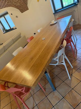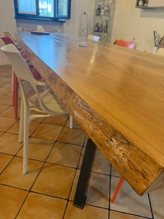 Splendido tavolo artigianale realizzato in legno di rovere massello. Il suo design unico lo rende un pezzo centrale per ogni ambiente. - Piano in legno di rovere con finitura naturale. - Gambe in metallo robuste.