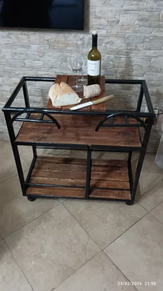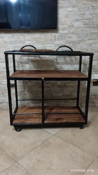 Te lo porto a casa (Piemonte e Lombarsia) mobile ARTIGIANALE restaurato o carrello da portata in perfetto stile industrial, ideale per arredare con carattere la cucina, il soggiorno o un angolo bar. Realizzato con una robusta struttura in ferro nero e solidi ripiani in legno con venature naturali a vista. Il carrello è estremamente versatile e funzionale grazie al design unico: Accostamento materico tra metallo e legno che si adatta a interni moderni, vintage o rustici. Ripiani Spaziosi: tre livelli di appoggio per bottiglie, bicchieri, stoviglie o piccoli elettrodomestici. Dotato di ruote piroettanti da un lato. Consegna economica