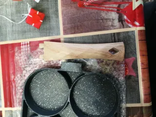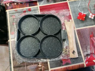 Padella per preparare pancake o uova. - Superficie antiaderente. - Quattro alloggiamenti circolari. - Manico in legno.