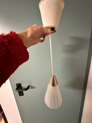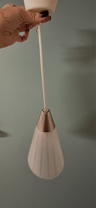 Lampada a sospensione vintage IKEA modello T9412. Un pezzo di design che aggiunge un tocco di stile unico. - Finitura in metallo spazzolato. - Diffusore in vetro rigato bianco.