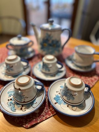 Splendido servizio da caffè vintage in ceramica dipinta a mano, realizzato dalla storica bottega Falvo di Rogliano (Cosenza). Un classico dell’artigianato calabrese caratterizzato da un delicato motivo floreale nei toni del blu e dell’azzurro su fondo bianco. Il set è composto da 11 pezzi: • 1 Caffettiera/Teiera con coperchio • 1 Zuccheriera con coperchio • 1 Lattiera • 4 Tazzine • 4 Piattini Condizioni: Ottime condizioni vintage, come da foto. I decori sono vividi e non presentano sbeccature evidenti. Perfetto per collezionisti o per dare un tocco rustico ed elegante alla tua tavola. #ceramica #vintage #falvo #rogliano #calabria #