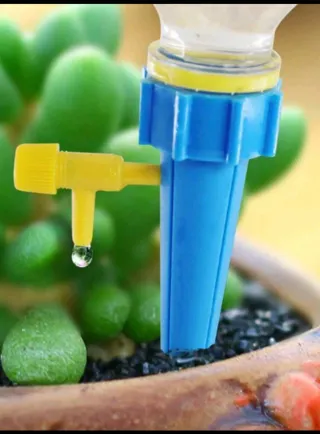 Set di sette dispositivi per l'irrigazione automatica delle piante. Ideali per mantenere le tue piante idratate. Da utilizzare con bottiglie di plastica - Colore blu e verde. - Design a cono con accessori inclusi.