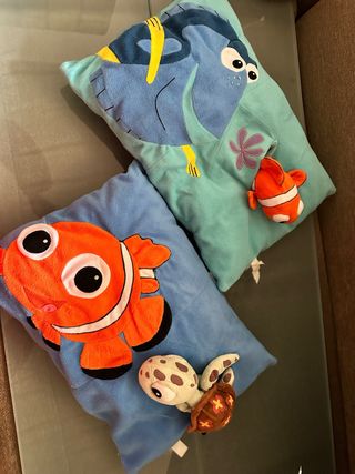 coppia di cuscini morbidi in pile Perfetti per arredare la cameretta o come compagni di nanna per i più piccoli! Caratteristiche del set: • Cuscino Nemo (Blu): Presenta una grande applicazione di Nemo e include un piccolo peluche della tartaruga Guizzo attaccato con un cordino elastico, che può essere riposto nella taschina frontale. • Cuscino Dory (Azzurro): Presenta una grande applicazione di Dory e include un piccolo peluche di Nemo attaccato con un cordino, anch'esso inseribile nella taschina dedicata. Tessuto tipo pile/velvet, molto soffice al tatto e confortevole. • Condizioni: Ottime, i colori sono vivaci e i tessuti puliti