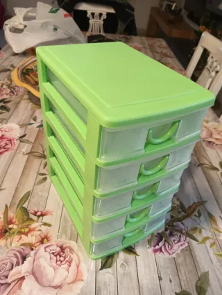 Pratica mini cassettiera con 5 cassetti trasparenti. - Maniglie a forma di arco. - Struttura in plastica resistente. - Misura 16x22x26,5cm, set 5 cassetti trasparenti con maniglia, organizer salvaspazio per piccoli oggetti, ufficio, camera da letto, scrivania (Verde e grigio) 10€ cadauno