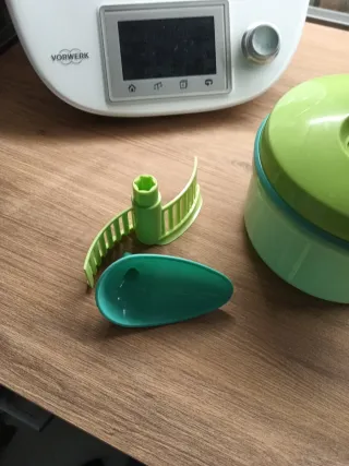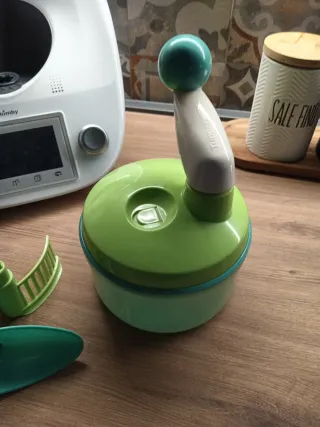 Utensile da cucina Tupperware Quick Chef. Colore verde e tiffany. Realizzato in plastica resistente, tritatutto e frullatore manuale Non richiede elettricità, funzionando tramite un meccanismo a manovella. È progettato per sminuzzare, tritare e mescolare vari ingredienti, come frutta, verdura ed erbe aromatiche. Accessori inclusi: Viene fornito con lame in acciaio inossidabile e accessori per montare.