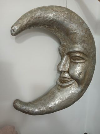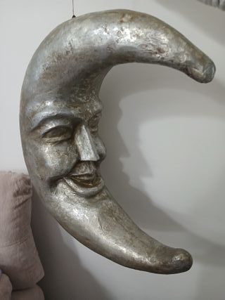 Decorazione a forma di luna crescente, realizzata in cartapesta. - Finitura effetto metallo. - Ideale per decorare pareti o soffitti. Decorazione Soffitto Parete Luna Crescente Cartapesta Argento 60 cm Vintage In buone condizioni come da foto