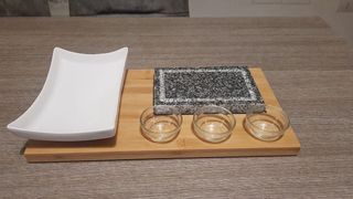 Vendo bellissimo set per aperitivo o cene a base di pietra lavica. Il set è composto da una piastra in pietra grigia, un piatto bianco in porcellana, un tagliere in bambù e tre ciotoline di vetro. Ideale per presentare antipasti o piatti caldi in modo elegante. - Piastra in pietra lavica di colore grigio - Piatto rettangolare in porcellana bianca - Tre ciotoline in vetro trasparente - Base in bambù robusta ed elegante