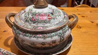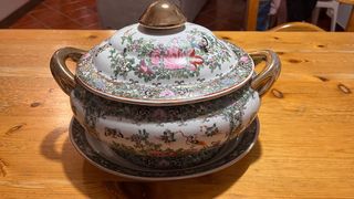 Splendida zuppiera antica di manifattura cinese. Elegante e raffinata, è perfetta per un tocco di classe sulla tua tavola. - Decorazioni floreali dipinte a mano. - Coperchio con pomello in metallo dorato. - Include un vassoio coordinato.