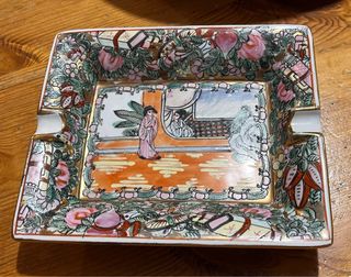 Bellissimo posacenere antico di manifattura cinese. Un pezzo unico per collezionisti! - Dipinto a mano con dettagli raffinati. - Motivi floreali e figure orientali. - Marchio visibile sul retro. - Ottimo stato di conservazione, considerando l'età.