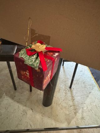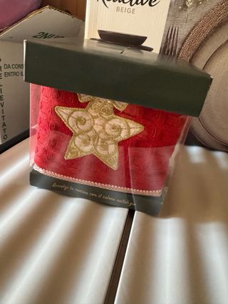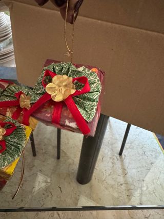 Set di scatoline decorative a tema natalizio, perfette per piccoli pensieri. - Decorate con nastri rossi e fiori dorati. - Realizzate con cura in tessuto e carta.
