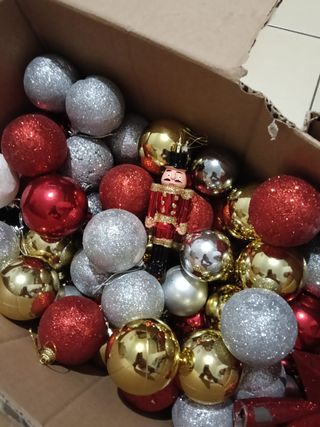 Set di decorazioni per albero di Natale. - Palline decorative in diverse finiture. - Stella decorativa scintillante.