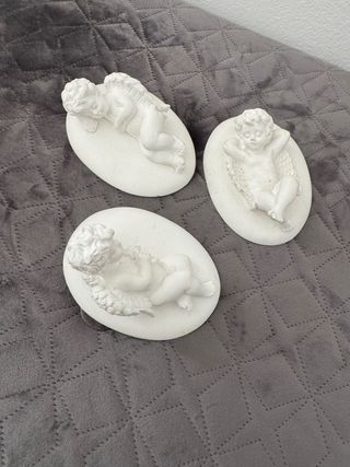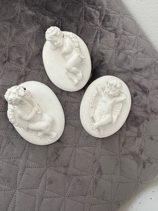 Set di tre decorazioni a forma di angelo, realizzate in pietra. Perfette per aggiungere un tocco di eleganza. - Tre angeli in posizioni diverse. - Dettagli finemente scolpiti.
