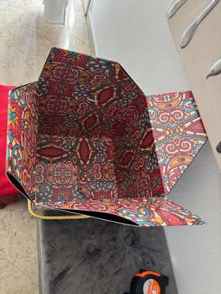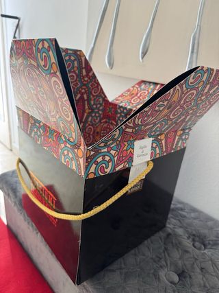 Elegante scatola regalo con un design vivace e colorato. Perfetta per presentare un dono speciale. - Decorazione interna con motivi paisley. - Manici in corda dorata. - Chiusura a forma di petalo.