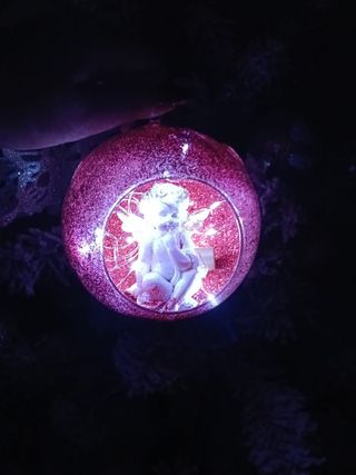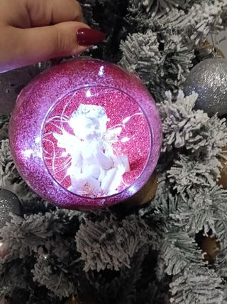 Deliziosa pallina di Natale in vetro, perfetta per aggiungere un tocco magico al tuo albero. - Decorazione interna con angelo seduto. - Finitura esterna scintillante con glitter. - Anello per appenderla incluso.