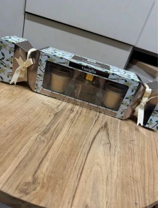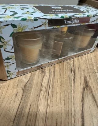 Set regalo profumatore d'ambiente alla vaniglia. - Include due candele profumate. - Un diffusore per ambienti. - Confezione decorata con fiori e bacche di vaniglia.