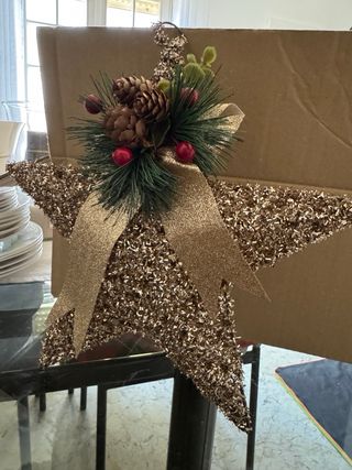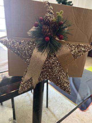 Splendido puntale per albero di Natale a forma di stella, perfetto per aggiungere un tocco scintillante alle tue festività. - Decorazione con pigne e bacche rosse. - Fiocco dorato in tessuto. - Finitura glitterata.
