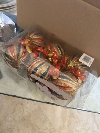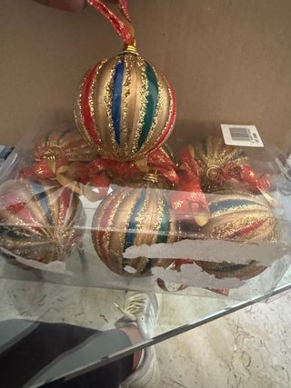 Set di sei palline decorative per l'albero di Natale. - Design a righe dorate con dettagli rossi, blu e verdi. - Finitura glitterata scintillante. - Ogni pallina è dotata di un nastrino per appenderla.