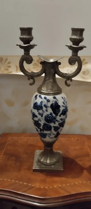Elegante portacandele a due bracci con base e dettagli in metallo e corpo centrale in ceramica decorata. - Design floreale blu su sfondo bianco. - Struttura in metallo finemente lavorato. - Base quadrata stabile.