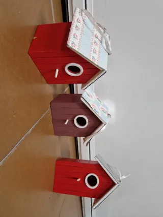 Set di tre casette decorative per uccelli. Ideali per aggiungere un tocco incantevole al tuo giardino o balcone, o alla stanza dei bambini. Casette in legno dipinte in rosso e viola. Tetti decorati con un motivo di uccellini e nastri. Ogni casetta ha un ingresso circolare.