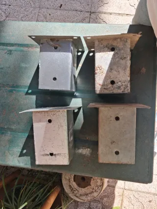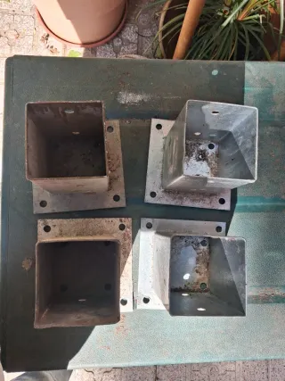 4 basi di supporto per pali quadrati in legno, ideali per la costruzione di pergole, recinzioni, portici o casette da giardino. Caratteristiche: Materiale: acciaio galvanizzato ad alta resistenza. Misura dell'imboccatura: progettati per pali di 70x70 mm (7x7 cm). Fissaggio: base con 4 fori per ancorare al terreno (cemento o legno) e fori laterali per fissare il palo con viti. Stato: usati.