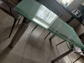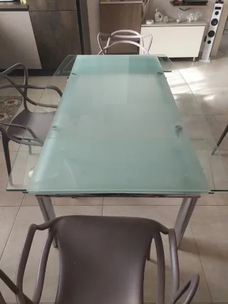 Elegante tavolo con piano in vetro e struttura in metallo. Il design moderno si adatta a diversi ambienti. - Piano in vetro trasparente e satinato. - Gambe in metallo resistenti. - Base in plastica per proteggere il pavimento. Misura 140cm allungabile 2 metri.