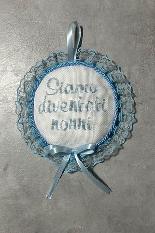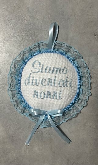 Coccarda decorativa realizzata a mano, perfetta per celebrare un lieto evento. - Decorata con pizzo azzurro. - Fiocco in raso azzurro con perla centrale. - Nastrino per appenderla.