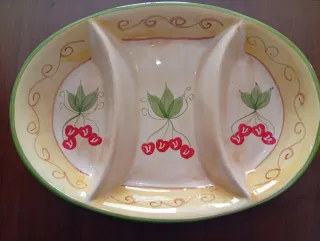 Elegante antipastiera in ceramica, perfetta per servire stuzzichini e antipasti. - Design a tre scomparti. - Decorazione dipinta a mano con ciliegie e viticci. - Bordo esterno con finitura verde.
