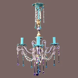 Elegante lampadario in stile vintage, con una splendida combinazione di colori viola e turchiese.Un lampadario molto elegante e leggero nei toni del lilla e del turchese. Ha tre bracci e tre punti luce, decorato con vetro di Murano e cristallo, ed è patinato. Perfetto per stanze piccole e soffitti bassi. Adatto a camere da letto, corridoi, bagni e camerette. Dimensioni: H 87 cm, L 45 cm. - Realizzato con materiali di alta qualità. - Dettagli in vetro e metallo.