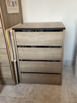 Mobile da archiviazione con quattro ampi cassetti. Design moderno e funzionale. Finitura in legno chiaro. Sono due comodini uguali. Uno in buone condizioni e l'altro con diversi graffi. 50 euro ciascuno. 80 euro per entrambi.