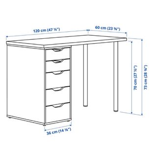 Tavolo da scrivania completo con due gambe e una cassettiera. Modello LAGKAPTEN / ALEX di Ikea. Piano e cassettiera in legno color rovere. Gambe in metallo bianco. Dimensioni tavolo: 120x60x73 cm. Cassettiera: 70x36 cm. Prezzo originale 111 €. Motivo vendita: trasloco.