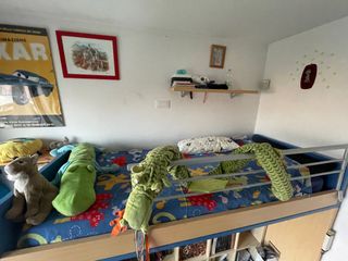 Letto a castello con un pratico terzo letto estraibile, perfetto per ottimizzare lo spazio: - Letto superiore, dimensioni 90x206x165(h) cm, materasso incluso - Letto sotto con terzo letto, dimensioni 90x206 cm, materassi inclusi - Cassettiera, dimensioni 45x90x45(h) cm - Cassettiera, dimensioni 45x45x60(h) cm - Mensola Vendo per rinnovo arredamento. Ritiro a carico del compratore per ovvi motivi di comodità... Scaletta mancante - Struttura in legno resistente. - Dettagli in tessuto e metallo.
