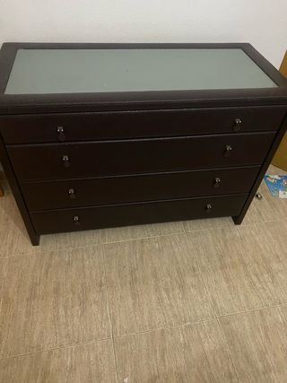 Set di comò e due comodini - Finitura in pelle sintetica. - Copertura in vetro - Maniglie in metallo