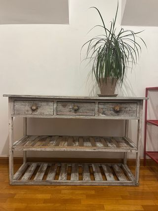 Una credenza ausiliaria dal design rustico e affascinante. - Tre cassetti superiori con maniglie. - Due ripiani inferiori in doghe. - Struttura in legno. In buone condizioni d'uso!