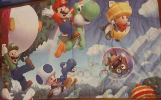 Tappeto con i personaggi iconici di Super Mario Bros. Un pezzo vivace e colorato per gli appassionati. 142x88 cm - Personaggi inclusi: Mario, Luigi, Yoshi, Toad, Goomba e Toadette. - Design a tema avventura con arcobaleno e bolle. - Ideale per decorare una cameretta o uno spazio gioco. Qualche piccola imperfezione come da foto.